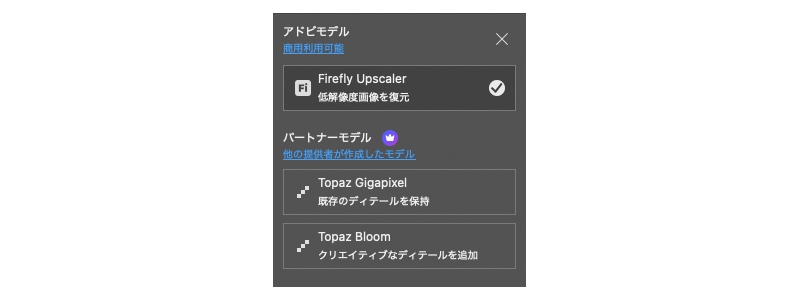 イメージメニュー→“生成アップスケール...”を選ぶとダイアログが表示され、使用するモデルや出力サイズを選べます。モデルの選択肢は、アドビの「Firefly Upscaler(低解像度画像を復元)」と、パートナーモデルの「Topaz Gigapixel(既存のディテールを保持)」および「Topaz Bloom(クリエイティブなディテールを保持)」です。