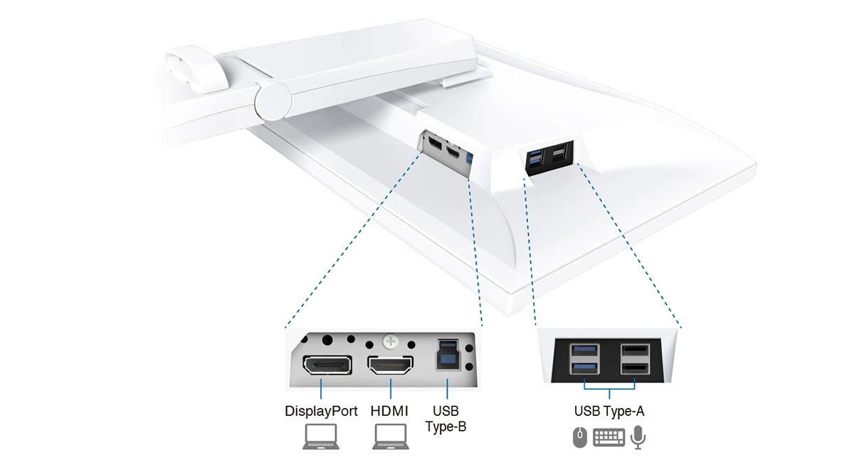 本体サイズ537.8(幅)×333.6〜473.6(高さ)×233(奥行)mm表示領域527(幅)×296.5(高さ)mm昇降140mmチルト角上35°/下5°スウィーベル344°縦回転右回り90°/左回り90°重量約5.6kg(モニター部は約3.5kg)アンチグレアタイプのIPSパネルを搭載し、推奨解像度は1,920×1,080pixelsとなっています(アスペクト比16:9)。従来機種の「EV2460」との比較で、輝度は250cd/㎡から350cd/㎡へ、コントラスト比は1,000:1から1,500:1へと強化されました。リフレッシュレート100Hz表示にも対応しています。色域はsRGB相当、標準応答速度は5ms(中間階調域)で、視野角は水平/垂直ともに178°です。USBハブ機能も搭載された使いやすいモデル映像入力用インターフェイスには、DisplayPortとHDMIポートが1系統ずつ用意されています。本体には1.0W+1.0Wのスピーカーも内蔵済みです。また、本製品にはUSBハブ機能も搭載されています。ダウンストリームポートは4基のUSB Aポートで、そのうち2ポートがUSB 5Gbps仕様、残り2ポートがUSB 2.0仕様です。各端子は全て本体の背面側に配置されました。映像入力用インターフェイスと、USBハブ機能のアップストリームポートが1カ所にまとめられています。ダウンストリームポートは全て側面に配置されているため、マウスやキーボードなどの接続がスムーズです。