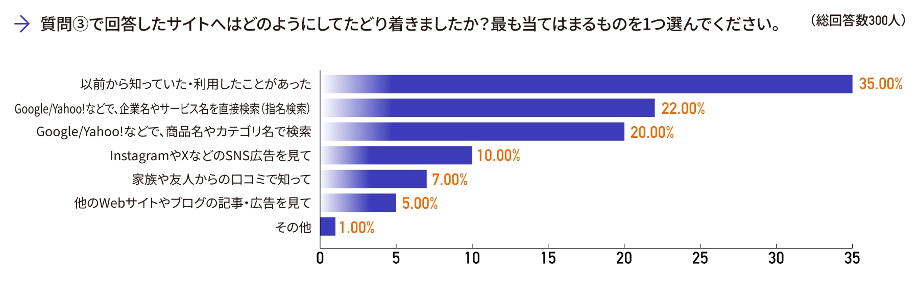引用:株式会社デザポケ(https://deza-poke.com)「そのサイトへはどのようにして辿り着いたか」という質問では、「以前から知っていた・利用したことがあった」(35%)や「企業名やサービス名を直接検索した(指名検索)」(22%)という回答が比較的に多い結果です。一方で「SNS広告を見て」(10%)や「口コミで知って」(7%)や「ほかのWebサイトやブログの記事・広告を見て」(5%)と回答したユーザーも一定数います。