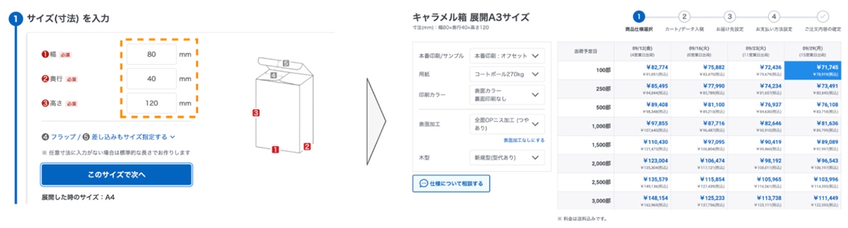 相談画面のイメージ本番の注文の前の箱のサンプル確認については、特に要望の多い無地箱の試作は希望の寸法のものを全てのユーザーに無料で提供しています。ただし、無料提供には部数や回数の制限があるため注意が必要です。* * * * * * * * * *パッケージ印刷の仕事では、条件を満たす商品を探すのが難しいと感じているユーザーも多いようです。「ラクスル パッケージ」は、サービスに必要な機能や分かりやすいUI・UXの検証などを経て、専門ECサイトとして開始されました。自由に寸法を指定して、対応可能な範囲であれば即座に価格表が提示されるため、注文までのステップがスムーズです。ラクスル株式会社