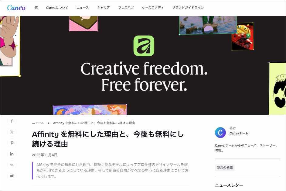 完全無料にする理由を説明する運営元Canva今回のAffinityの完全無料化には多角的な分析が必要であると感じます。私自身、前回の記事執筆のためにAffinity V2をトライアル期間中に試用しましたが、その後、本格的に業務で活用する機会はほとんどありませんでした。同様に、Affinity V2を試用・購入したにもかかわらず、仕事ではやはりAdobeを使用し、Affinityを使う機会はあまなかったというユーザーも少なくないのではないでしょうか。こうした背景を見ても、Affinityがユーザー拡大を目的にセールや無料トライアルキャンペーンを展開しても、プロ現場でAdobeの代替ツールとして定着することは困難であったことは、容易に推測できます。そのため、今回の完全無料化をポジティブな側面だけで捉えるのは早計です。上記のようなキャンペーンでは効果を得られないため、Adobeが築いた市場で存在感を確立するには「完全無料化」という大胆な戦略しかなかったと考えるのが妥当ではないでしょうか。また、Canvaは、何らかの方法でAffinityの事業を収益化する必要があります。Canvaアカウント連携を通じて、有料サービスへの誘導など課金ポイントが設けられる可能性があることは念頭に置いておきましょう。「Affinity by Canva」に関しての4つの可能性と課題前述の通り、Affinity by Canvaのコア技術の多くはV2からの延長線上にあり、機能面で大きな変更はありません。改めてその可能性と課題を考察します。1.印刷対応