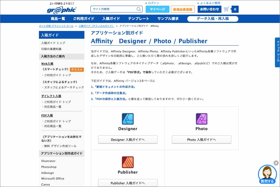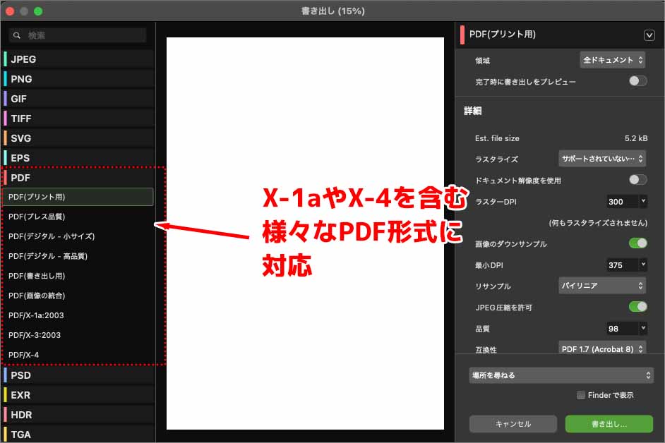 様々なPDF形式に対応するAffinityまた、すでにいくつかの印刷所でAffinity用の入稿ガイドラインを提供の動きがあります。例えば、プリントサービス大手の「グラフィック」では以前より、Affinity向けの入稿ガイドを提供しており、今回の無料化に際してもいち早くX(旧Twitter)にてAffinityでの印刷対応可能である旨を投稿していました。