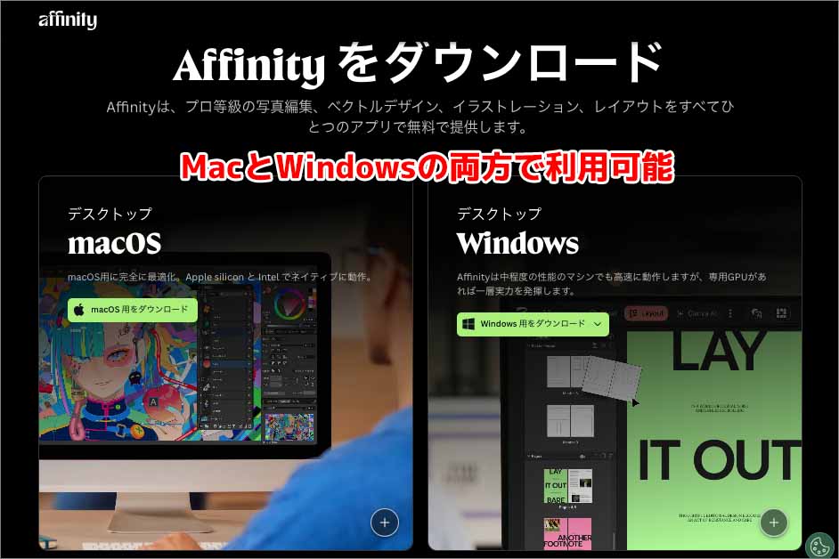 Mac版、Windows版の両方のOSで利用可能加えてMac版、Windows版の両方のOSで利用できるため、異なるOS間で同じソフトウェアを無料で利用できることも大きな強みになっています(iPad版もAffinity V2のロゴイメージが使われているがiPad版もPC版と同様に「Affinity by Canva」として無料提供されている)。一方で、Canvaアカウントとの連携が必須になったことで、単なる買い切りツールではなく、SaaS的な運用要素も加わったため、初回のアクティベーションや定期的なアカウント確認などネット接続が必要になります。通常の使用においてはオフラインでの基本的な作業も可能ですが、先日のAdobeの大規模な障害も、こうしたSaaS的な運用要素が要因と一つになっていたと考えられますので、この点はデメリットにもなりうるということは留意しておきましょう。本当に完全無料化なのか?