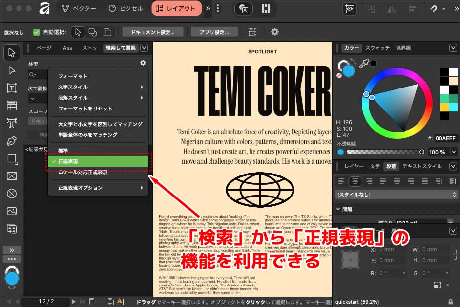 Affinity by Canvaの正規表現機能ただし、InDesignが持つような一部の高度な表現(例:特定のルックアラウンドアサーションのバリエーション、特定のUnicodeプロパティの指定方法など)には対応していない場合があります。また、InDesignの正規表現には、段落スタイル内で正規表現を設定することで、特定のパターンに一致するテキストに自動的に文字スタイルを適用する「GREPスタイル」という非常に強力な機能が搭載されていますが、今のところAffinityは「GREPスタイル」に直接相当する機能は搭載されていません。加えて、Affinity Publisherは現在スクリプト機能をほとんど持っていないため、正規表現を使った高度な自動処理は、「検索と置換」パネルの範囲内に限定されます。▶︎ルビや約物