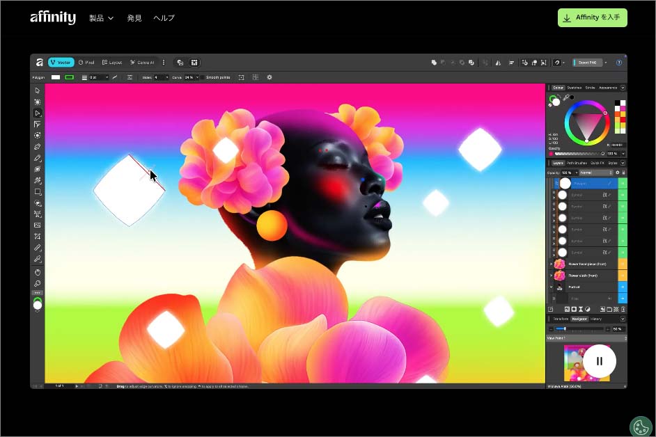 統合インターフェース内でツールを切り替えることが可能しかし、バージョン2から導入された「StudioLink」機能の強化により、「Affinity by Canva」の統合インターフェース内で、Designer、Photo、Publisherといったペルソナを各機能としてシームレスに扱えるようになりました。画面上部の切り替えタブでは、それぞれ「Affinity Designer」は「ベクター」、「Affinity Photo」は「ピクセル」、「Affinity Publisher」は「レイアウト」と表示され、共通のキャンバスで各機能を切り替えることができます。これにより、ツール間でオブジェクトをコピー&ペーストしたり、ファイルを読み込み直したりといった作業が不要になり、ワークフローが大幅に効率化されています。このようにDTP系の機能が統合されたワークフローで、軽量で高速なプロユースのグラフィックツールを実現している点は、Adobeにはない魅力と言えるでしょう。また、UIやクラウド連携など、運営元であるCanvaの要素が加わったのも大きなポイントです。