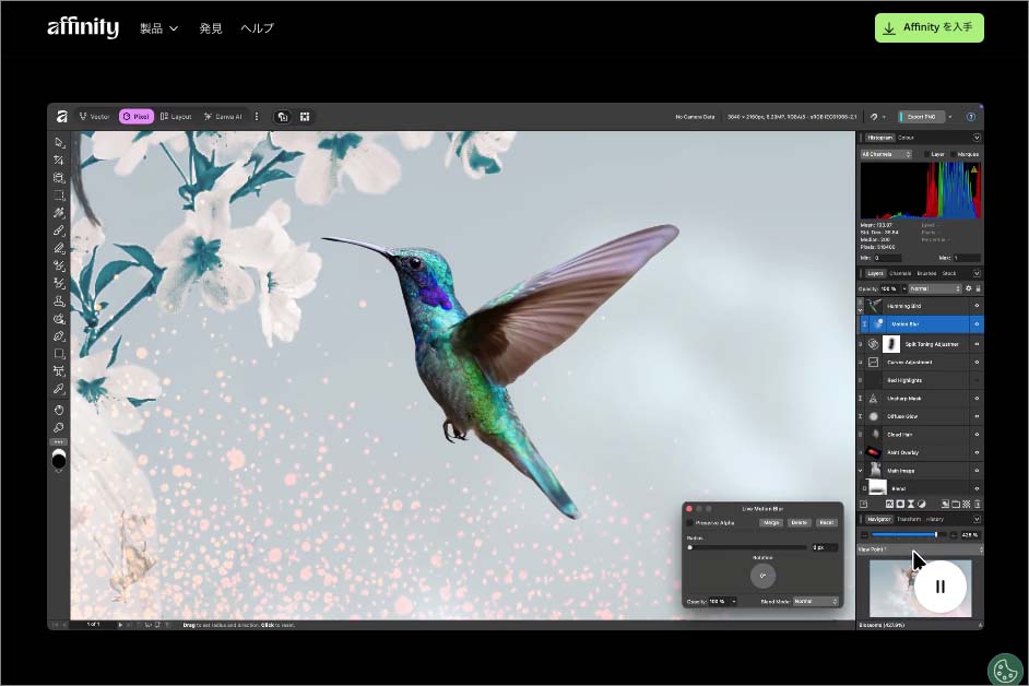Affinity Photo写真データをはじめとして、ラスター(ピクセル)画像のデータに関しては、かなりファイル互換性が高いと言えます。もともと、こうした画像編集ツールに関しては、Affinity以外にも無料ツールが多く提供されています。ただし、Affinityは本格的なレタッチが可能なプロユースの無料ツールですので、Adobe CCのフォトプランからAffinity Photoへ移行するクリエイターも少なくないと考えられます。▶︎Adobe InDesign→Affinity Publisher