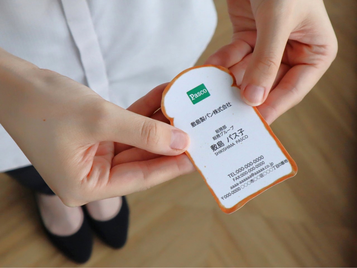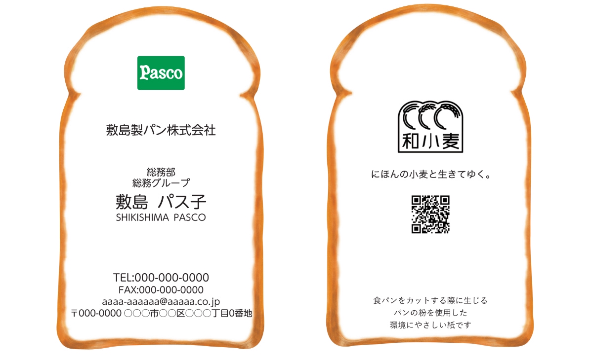 「食パン型名刺」のデザイン* * * * * * * * * *「パンの紙」の開発には、約1年半の歳月が費やされました。試行錯誤の末の工夫によって、意図的にパンの痕跡を残した荒々しい表面と、しっかりと印刷適性のある紙という相反する課題がクリアされています。ペーパルは、引き続きさまざまな未利用資源を活用した新たな価値の創造を目指しており、今後も新しい発想の紙の登場に期待したいところです。株式会社ペーパル/敷島製パン株式会社