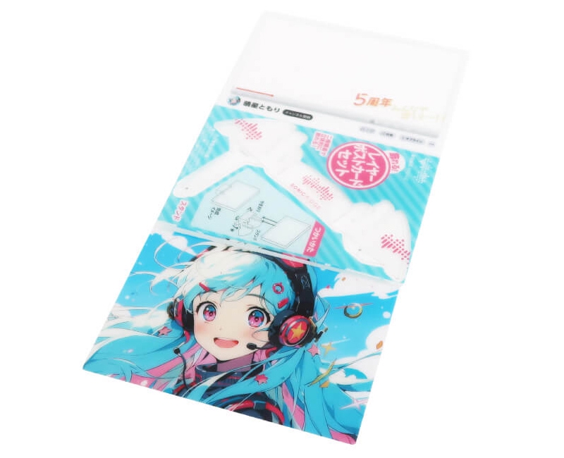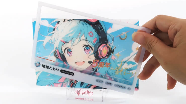 大同至高 オリジナル推し活グッズ特集URL:https://ddsp.jp/product/special/oshikatsu.html今回の商品は、小ロットで50個から、大ロットで1,000個からの注文に対応しています。それぞれの違いは、小ロットではUVインクジェット印刷、大ロットではUVオフセット印刷が使用されることです。数量が未定の場合にも「お気軽にお問い合わせください」とアナウンスされています。納品時はシート状であるため配布に便利本商品はクリアイラストカードとスタンドがセットになっているアイテムです。前後に重なるように2枚のカードをスタンドに立てることで、立体感が生まれます。たとえば、SNSや動画サイトの画面のような中央にアキ空間のあるデザインのクリアイラストカードにすると、キャラクターが印刷された別のポストカードを重ねたときに奥行きのあるライブ感を演出できる仕組みです。