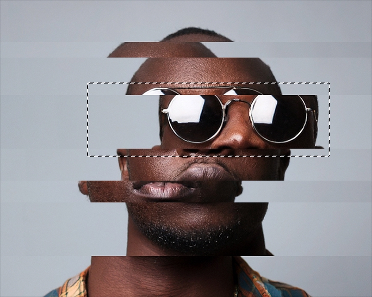 図4Photoshopのフィルター効果でグリッチノイズを表現: 2.部分的にフィルターをかける前の状態に戻すフィルター効果のかかり具合を調整する。まず、レイヤーパネルで元写真のスマートフィルターマスクサムネールをクリックして選択したら(図5)、長方形選択ツールで「波形」フィルターをかける前の状態に戻したい場所をドラッグして囲む。ここでは人物の目の部分に選択範囲を作成した(図6)。