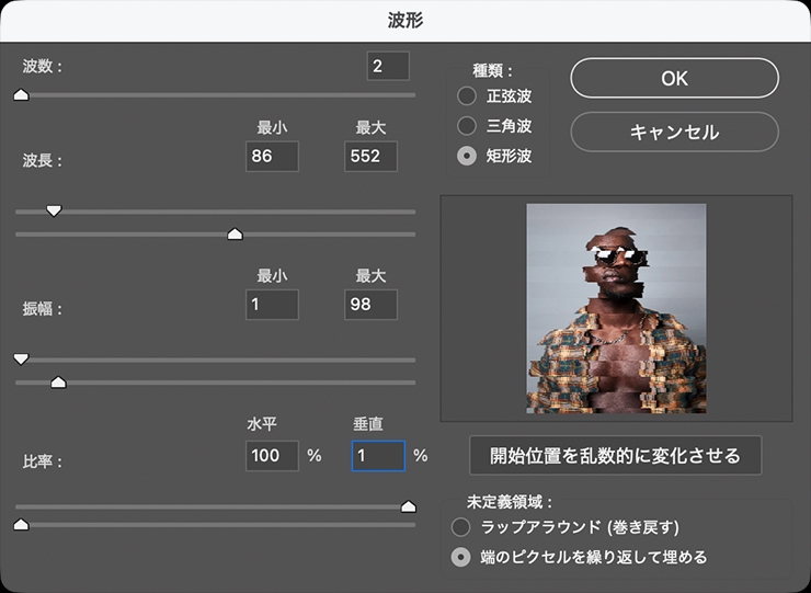 図3。[波数:2]、[種類:矩形波]、[波長]を[最小:86、最大:552]、[振幅]を[最小:1]、[最大:98]、[比率]を[水平:100%、垂直:1%]、[未定義領域:端のピクセルを繰り返して埋める]に設定する。[開始位置を乱数的に変化させる]をクリックすると効果のかかり方がランダムに変化するので、必要に応じてプレビューを参考にしながらクリックしてみてほしい