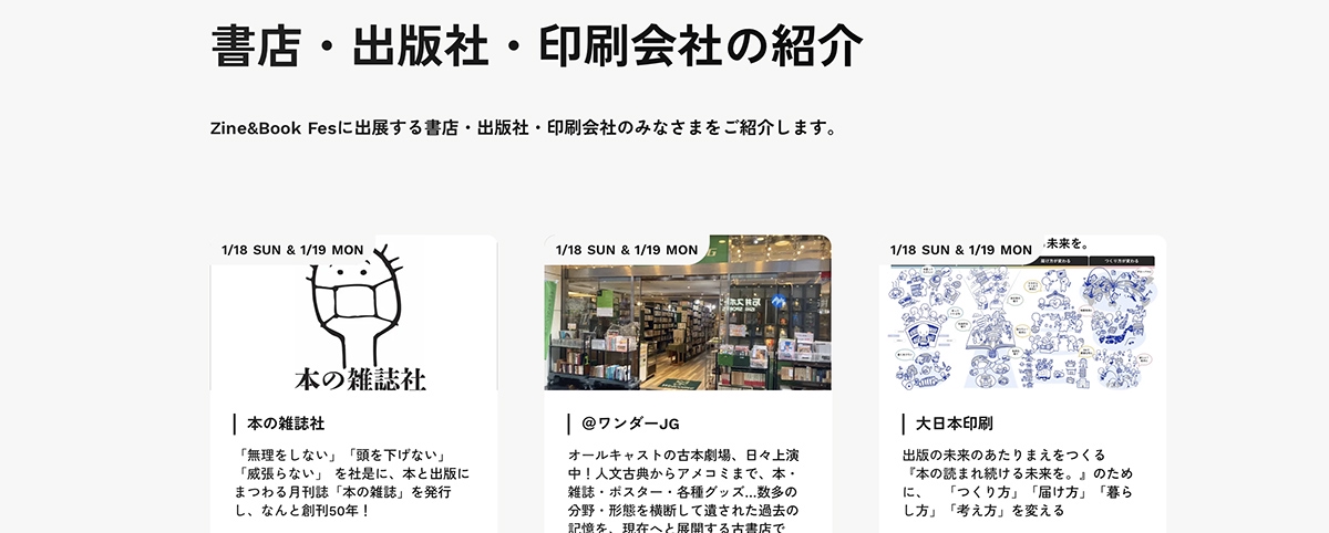 公式Webサイトの「書店・出版社・印刷会社の紹介」Zineや出版文化について語られる対談・座談会「イベントエリア」では、本やZineに詳しい専門家や有識者による5つのトークセッションが実施されます。初日の1月18日(日)のテーマは「神保町・本の文化のこれから(16:00~17:00)」と「若手が語るこれからの神保町(18:00~19:00)」で、2日目の1月19日(月)のテーマは「新しい本 デジタル文化の創造(13:30~14:30)」「神保町歴史談義とこれからの神保町(15:00~16:30)」「私たちにとっての本とZINEの流通:これまでとこれから(18:00~19:00)」です。そのほか事前予約制ですが、手作業でZineを制作するワークショップやZineの制作にまつわる法律講習会も実施されます(いずれも定員に達したためチケット販売終了済み)。