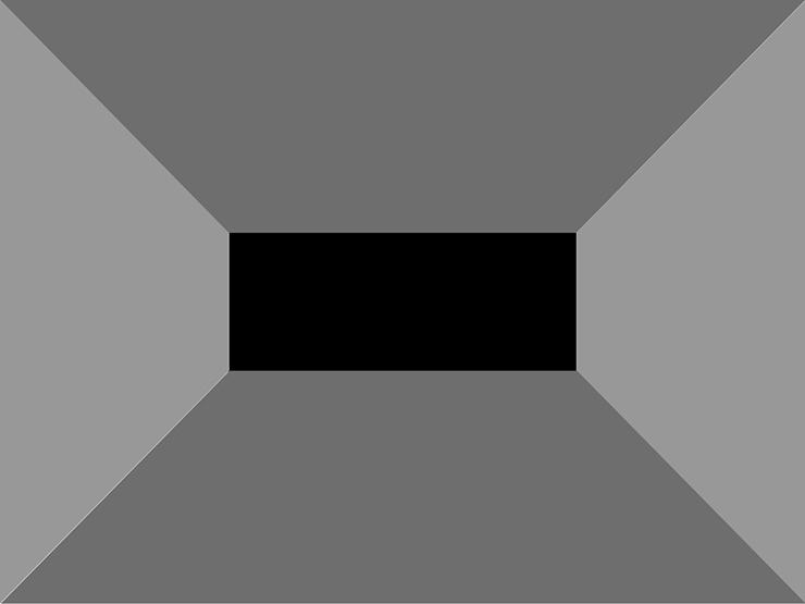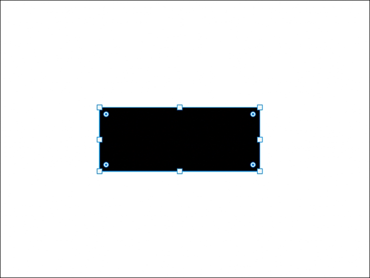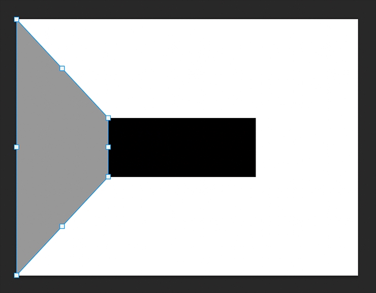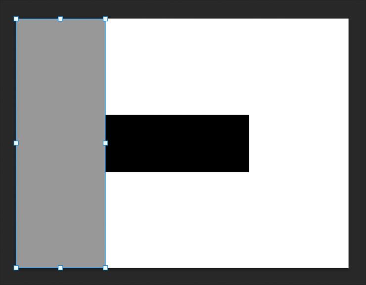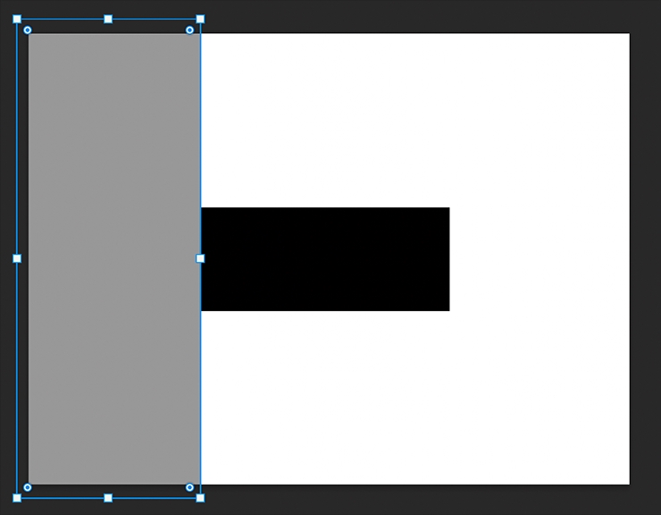 図6。黒い長方形の左辺とカンバスの端に、グレーの長方形の辺が接するよう変形する。表示メニュー→“スナップ”が有効になった状態だと、カンバスの境界線やオブジェクトの端に吸着させながら正確に変形できる続いて、編集メニュー→“変形”→“遠近法”を選び、バウンディングボックスの右上か右下のハンドルをドラッグして、黒い長方形の角に合わせて変形する(図7)。