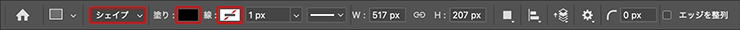 図1。長方形ツールのオプションバーで[ツールモード:シェイプ]、[塗り:黒]、[線:なし]に設定する