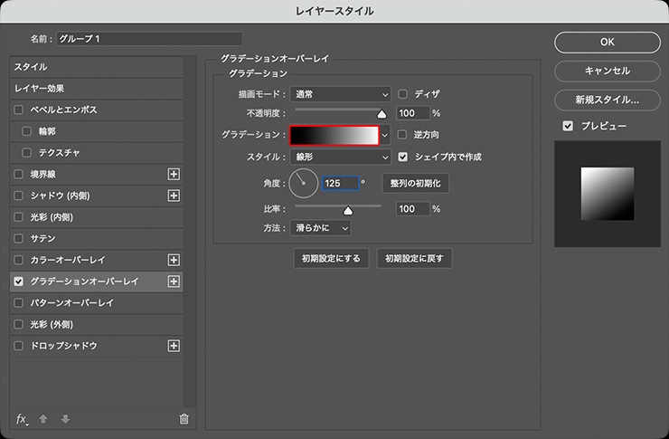 図20。この時点のレイヤーの状態この文字のレイヤーグループが選択された状態のまま、レイヤーメニュー→“レイヤースタイル”→“グラデーションオーバーレイ...”を選び、[描画モード:通常]、[不透明度:100%]、[スタイル:線形]、[角度:125°]、[比率:100%]、[方法:滑らかに]に設定(図21)。