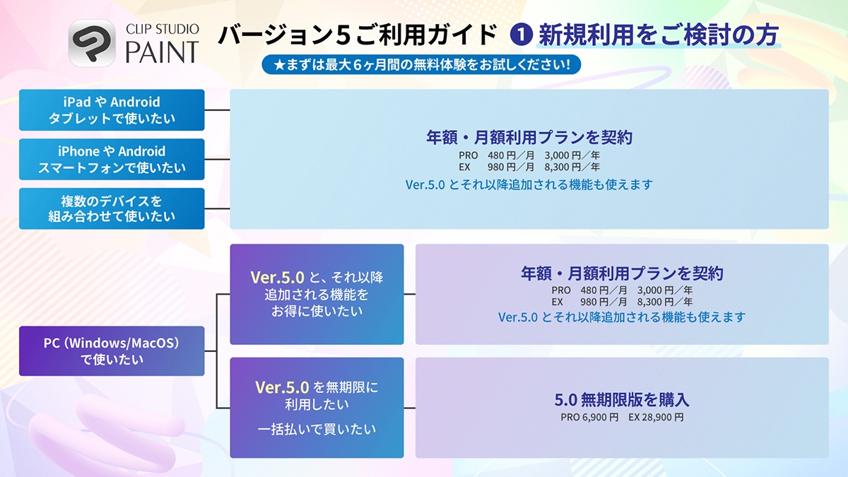 そのほかにも、ぼかし品質の改善や塗りつぶしの高速化といった各種の描画性能の向上に加え、3Dモデルのグループ化や非表示レイヤーの一括削除、日々の作業時間のグラフ表示などの操作も行えるようになります。変形機能の改善やカラープロファイル設定の最適化も実施されており、シンプルモードにはパペット変形/3D頭部モデル/サブビューが追加されるなど、充実のアップデート内容です。利用状況ごとに異なるVer.5.0の導入方法Ver.5.0からの新規ユーザーは、「年額・月額利用プラン」で契約したり、無期限版を購入したりすることで利用できます。無期限版のDL販売価格は、「PRO」が6,900円(税込)、「EX」が28,900円(税込)です。パッケージ販売も予定されており、そちらは「PRO」が9,240円(税込)、「EX」が38,720円(税込)となります。