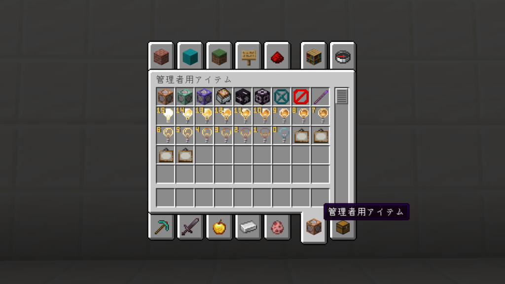 Java版ではクリエイティブ「管理者用アイテム」を有効にすることで、インベントリからの入手も可能になります。