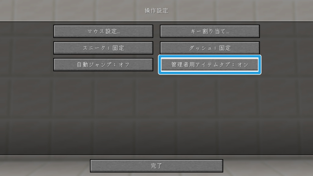 ゲームプレイメニュー内の設定から、操作設定の中にある管理者用アイテムタブの項目を切り替えることでオンにできます。