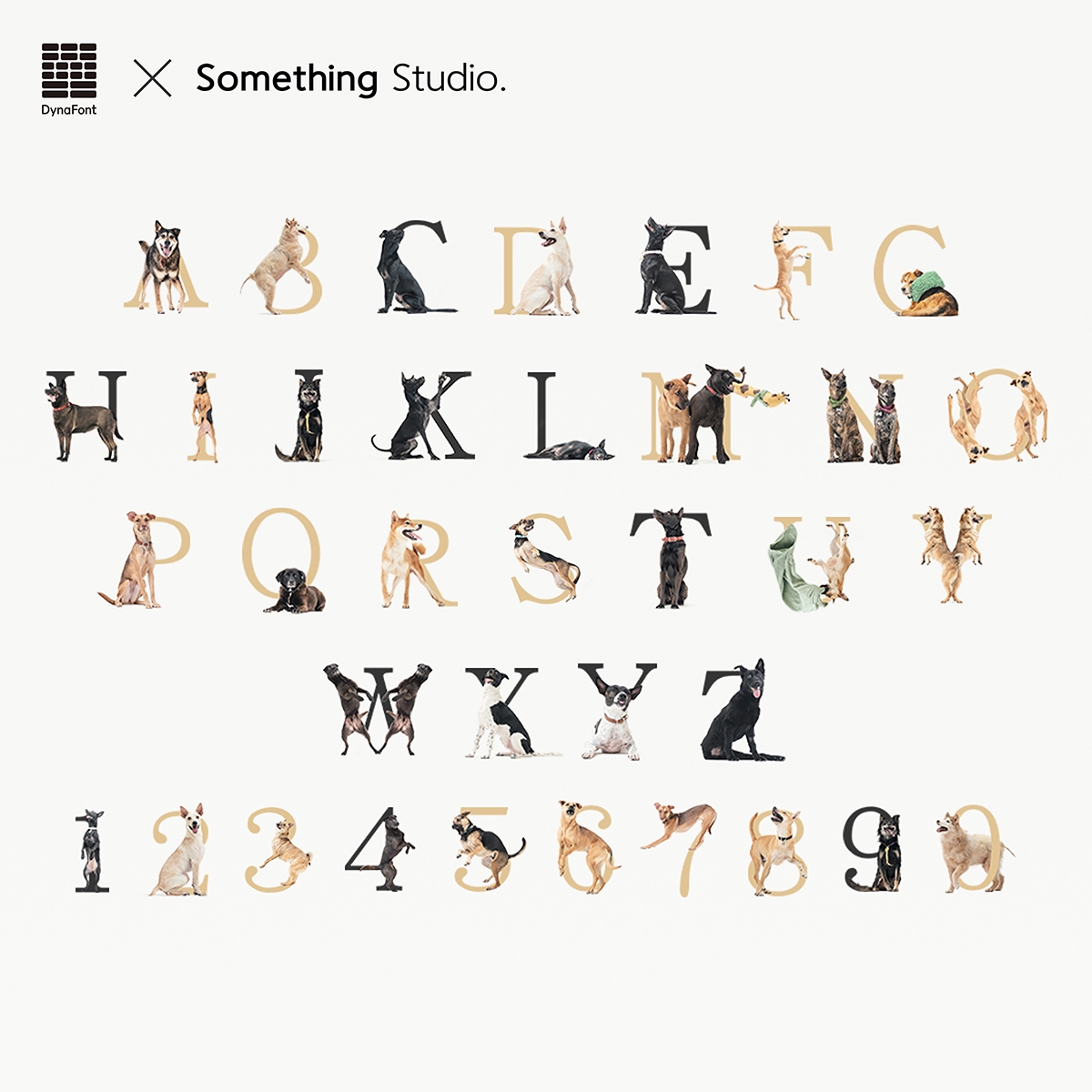 「DF RunGoGo Type」に収録されている文字その「DF RunGoGo Type」の無料配布が、日本のダイナコムウェアの公式サイトでも開始されています。「一文字一文字が、一匹一匹の保護犬」というコンセプトのもと、ユニークなポーズをとる犬たちの写真を楽しめるカラーフォントです。「DF華康明朝体W5(繁体字中国語版)」に含まれる英数字をベースに、保護犬たちの躍動感あふれる姿が組み合わせられています。