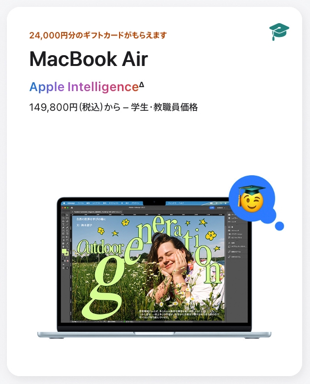 Appleは、2026年4月8日(水)まで、学生・教職員向けの「新学期を始めよう」キャンペーンを実施しています。対象製品の購入で、最高24,000円分のAppleギフトカードがプレゼントされる内容です。Apple Storeでは、学生を対象にした無料のToday at Appleセッションも毎日開催されています。【目次】春からの入学が決まった生徒も対象本キャンペーンでは、対象のMacかiPadを学割価格で購入することで、Appleギフトカードを受け取ることができます。Appleの学生・職員向けストアで割引価格で製品を購入できるのは、日本国内の以下の対象の学生および教職員です。・大学、高等専門学校、専門学校の学生・上記の教育機関への入学許可を得て進学が決定した生徒