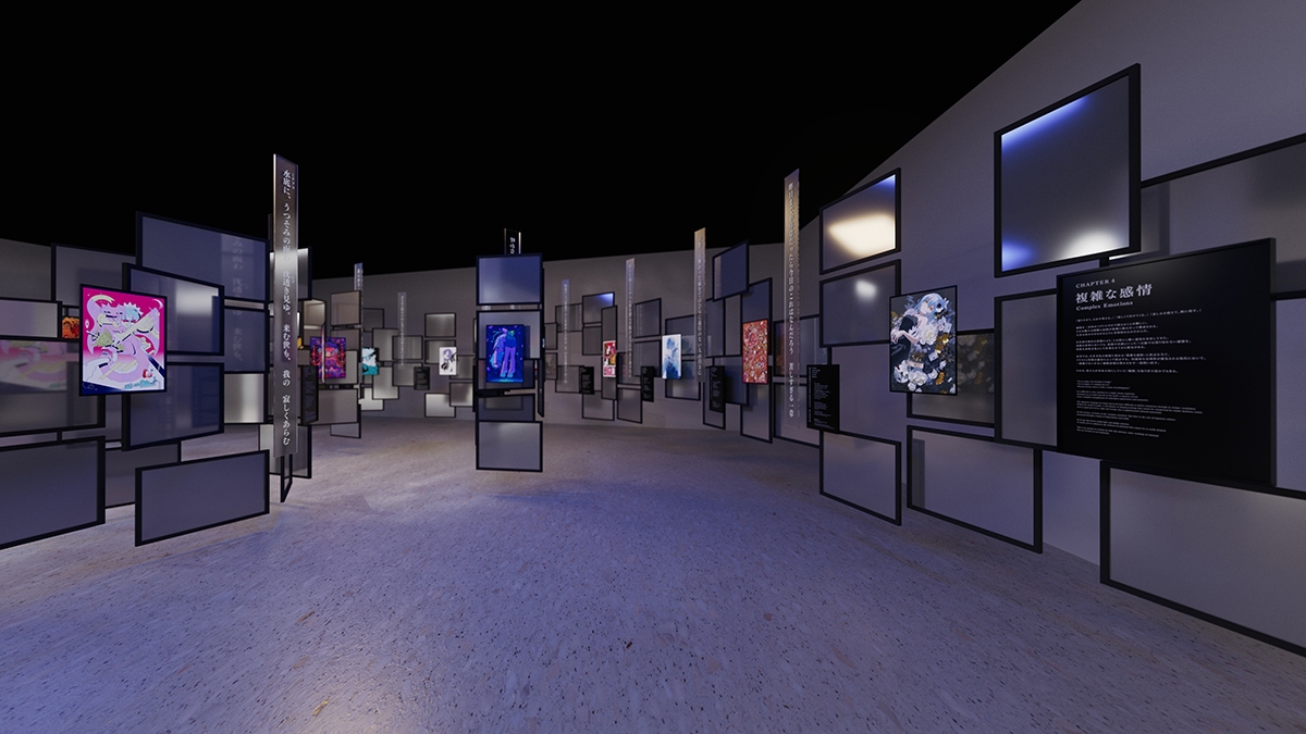 空間全体で作品を体験できるような演出今回の展覧会には、50名以上のイラストレーターや歌人が参加しています。展示空間全体は1つの物語のように設計され、短歌とイラストの作品が一堂に会する空間は、それぞれの作品に内包されている「感情」に注目できるように、空間全体で作品を体験できる構成です。