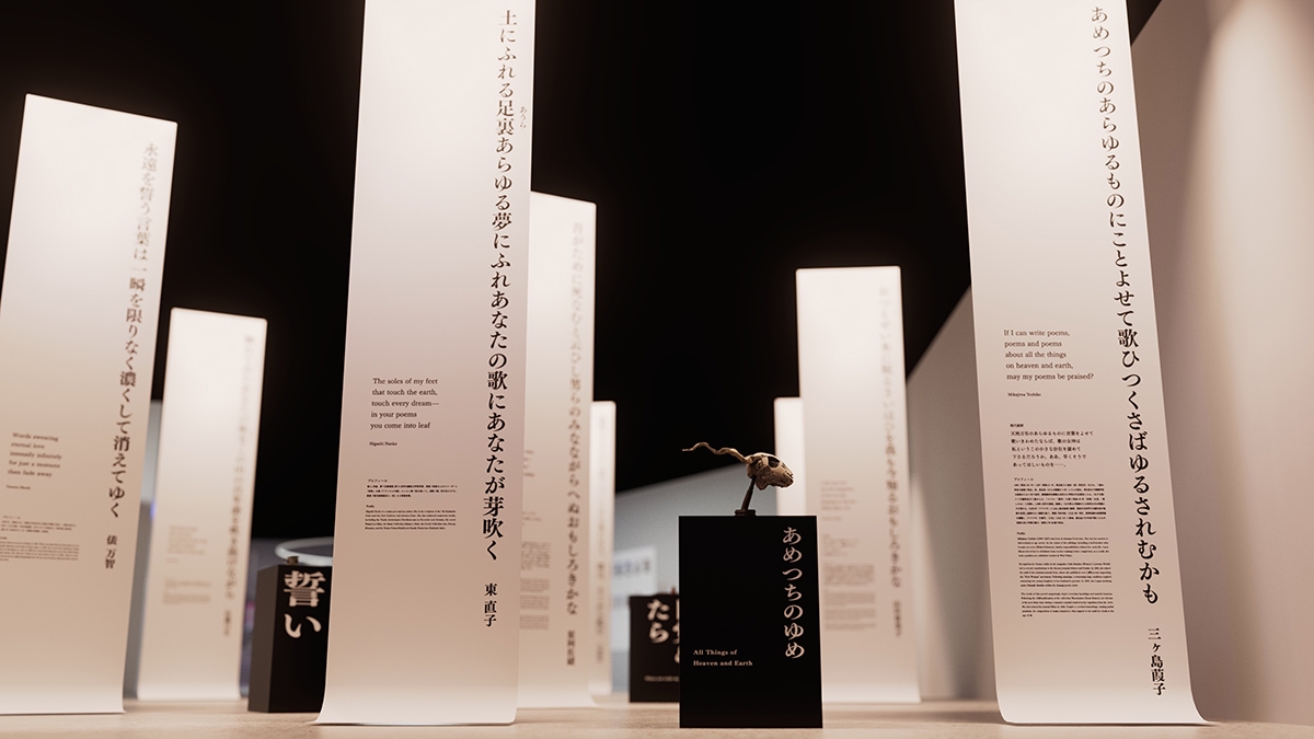 本展のクリエイティブディレクションは、人気イラストレーター・クリエイティブディレクターのMika Pikazo氏が担当しています。会場には同氏による描き下ろしの大作も登場し、与謝野晶子(1878〜1942年)や石川啄木(1886〜1912年)など近代歌人のことばが響き合うエリアが作り上げられました。また、本展では、近代短歌と現代の歌人による短歌が呼応するような展示も繰り広げられています。