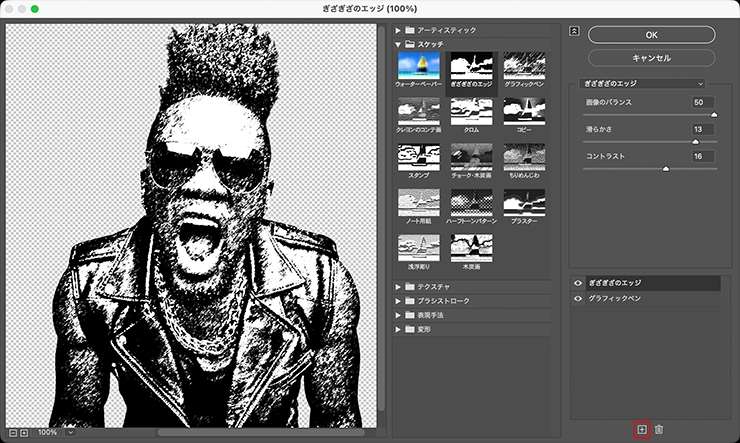 図7。赤枠部分の[+]ボタンをクリックしてエフェクトレイヤーを追加し、[スケッチ]の[ぎざぎざのエッジ]を[画像のバランス:50]、[滑らかさ:13]、[コントラスト:16]に設定する続いて[+]ボタンをクリックしてエフェクトレイヤーを追加し、[スケッチ]の[スタンプ]を[明るさ・暗さのバランス:32]、[滑らかさ:2]に設定して適用する(図8)(図9)。