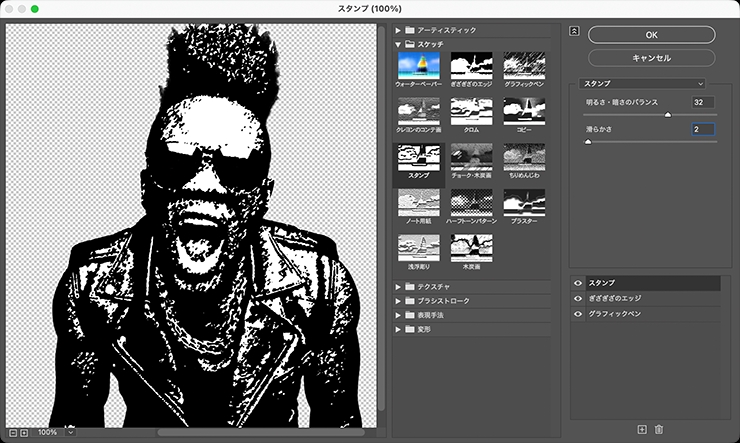 図8。エフェクトレイヤーを追加し、[スケッチ]の[スタンプ]を[明るさ・暗さのバランス:32]、[滑らかさ:2]に設定する