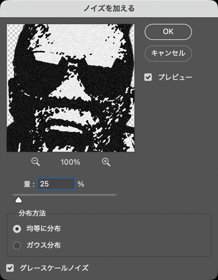 図10。[量:25%]、[分布方法:均等に分布]に設定し、[グレースケールノイズ]にチェックを入れる