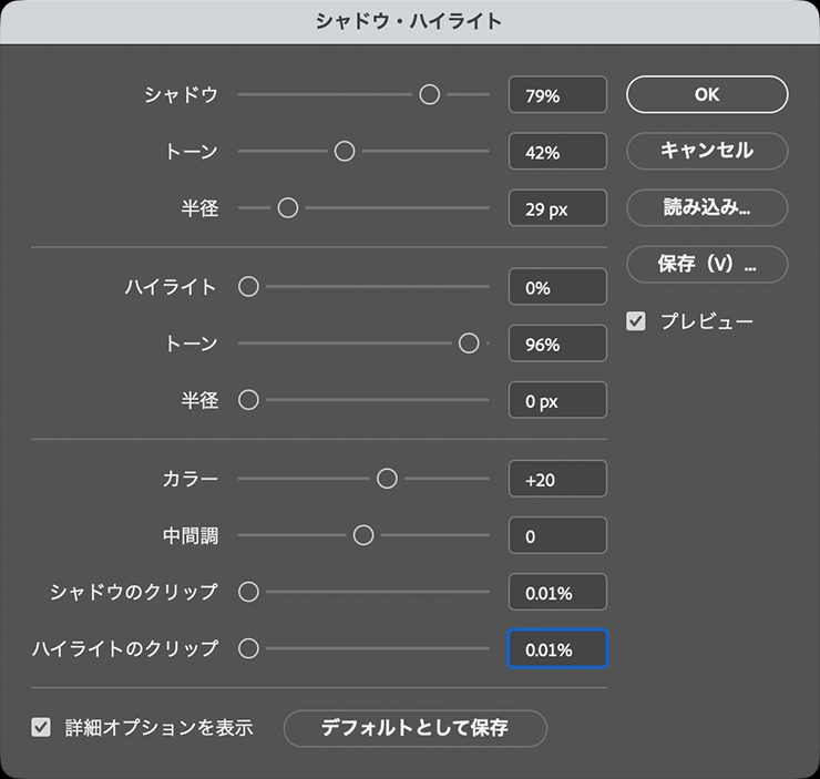 図2。各スライダーを動かして画像を明るめに調整する。ここでは、上から[シャドウ:79%]、[トーン:42%]、[半径:29px]、[ハイライト:0%]、[トーン:96%]、[半径:0px]、[カラー:+20]、[中間調:0]、[シャドウのクリップ:0.01%]、[ハイライトのクリップ:0.01%]に設定した