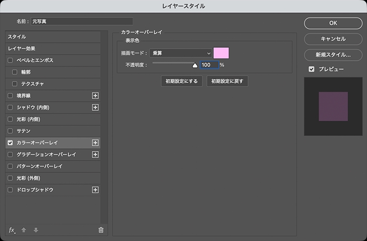 図12。レイヤースタイルの[カラーオーバーレイ]を、[描画モード:乗算]、[オーバーレイのカラー]をピンク(ここでは16進数カラーコード[#ffbbf6])、[不透明度:100%]に設定する