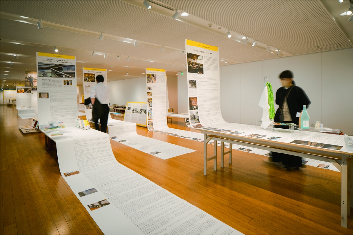 2023年の展示風景本展は、公益財団法人日本デザイン振興会(JDP)と公民館のしあさって・プロジェクトによる共同の企画・運営のもとで開催されています。公民館のしあさって・プロジェクトは、公民館の「今」を追いかけながら、遠い未来ではなく「しあさって」の公民館を皆で作るべく活動しているプロジェクトです。社会教育法のもとで定義されている公民館だけではなく、「公民館的なもの」を含む広い意味での「公民館」を対象としています。今回の展覧会では、展示のほかに会場内で連日トークイベントも開催中です。トークイベントの聞き手を、同プロジェクトのコアメンバーである西山佳孝氏と、メンバーの大里みずき氏が担当しています。