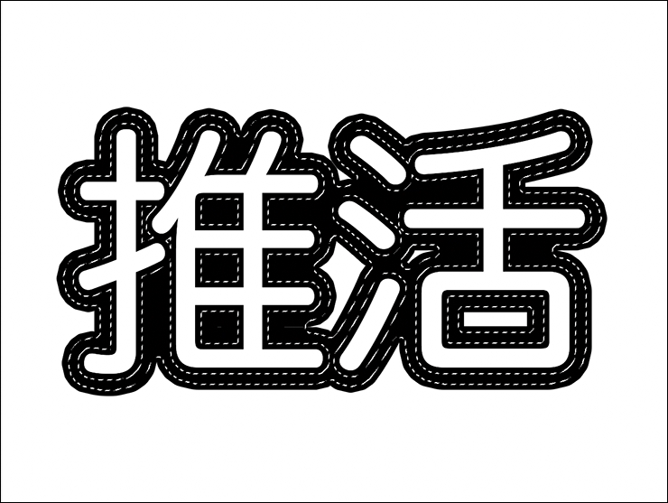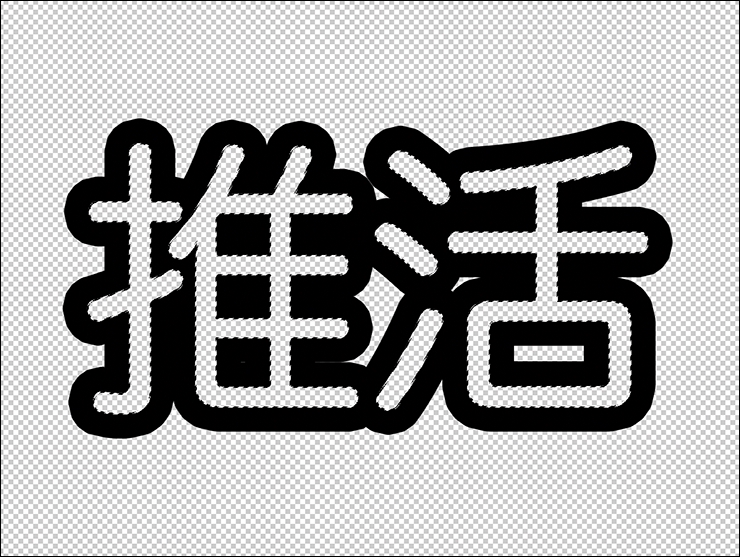 1.元となる文字を配置して縁取りをつけるまずは新規ファイルを[幅:1200ピクセル]、[高さ:900ピクセル]、[解像度:350ピクセル/インチ]で作成したら、横書き文字ツールで元になる文字(ここでは「推活」)を入力し、文字パネルでフォントやフォントサイズなどを設定。フォントカラーは黒にしておく(図1)。