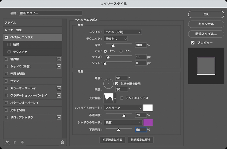 図18次に、レイヤーパネルで複製した方の文字のレイヤーを選択したら、レイヤーメニュー→“レイヤースタイル”→“ベベルとエンボス...”を、[スタイル:ベベル(内側)]、[テクニック:滑らかに]、[深さ:300%]、[方向:上へ]、[サイズ:13px]、[ソフト:0px]、[角度:90°]、[高度:30°]、[光沢輪郭:ローリングスロープ - 下向き]、[ハイライトのモード:スクリーン]、[ハイライトのカラー:白]、ハイライトの[不透明度]を70%に、[シャドウのモード:乗算]、[シャドウのカラー]をピンク(ここでは16進数カラーコード[#9e43ac])、シャドウの[不透明度]を50%に設定する(図19)。