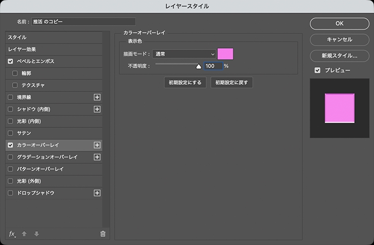 図17。レイヤースタイルの[カラーオーバーレイ]を、[描画モード:通常]、[オーバーレイのカラー]を明るいピンク(ここでは16進数カラーコード[#ec88e4])、[不透明度:100%]に設定する