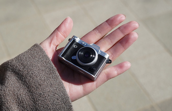 ミニカメラの筐体は、一般的には軽量性やコスト面に配慮してシリコン製やプラ製のものが多いですが、本製品にはアルミが用いられています。本格的な質感で、昔ながらのフィルムカメラを想起させるレトロな雰囲気も相まって、おしゃれなデザインです。