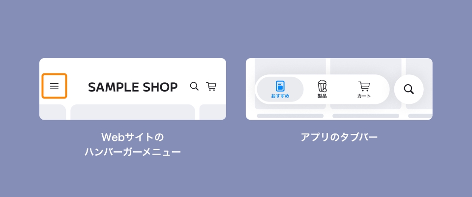 おそらく、左の画面がWebサイト風に感じられたのではないでしょうか。それでは、両者の違いはなんでしょうか? どちらも「商品を購入できる」という点では同じなのに、なぜそのような見た目の違いが生まれるのでしょうか? この差こそ、Webサイトとアプリの似てるようで全く違う構造上の違いが現れているのです。そこで今回は、表層に現れる「見た目の違い」に着目して、Webとアプリにおける構造上の違いを探っていきます。目次Webサイトとアプリの違い/その壱「メニュー」先ほどのWebサイトとアプリの画面には、メニュー表現に大きな違いがあります。左には「ハンバーガーメニュー」、右には「(Webサイト風に表現すると)固定フッターメニュー」があります。