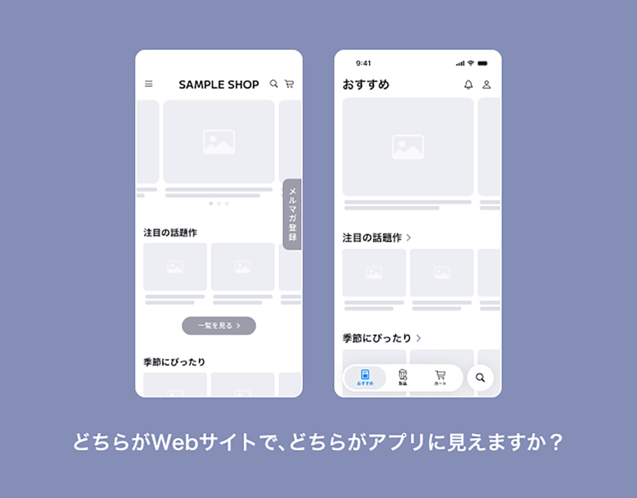 ここに2つのスマートフォンの画面があります(※下記のイメージ画像を参照)。どちらも、なんらかの商品を選択して、商品を購入できるサービスの画面です。実はこの2つの画面は、それぞれWebサイト風・アプリ風になるようにデザインしています。どちらがWebサイトっぽく感じられましたか?