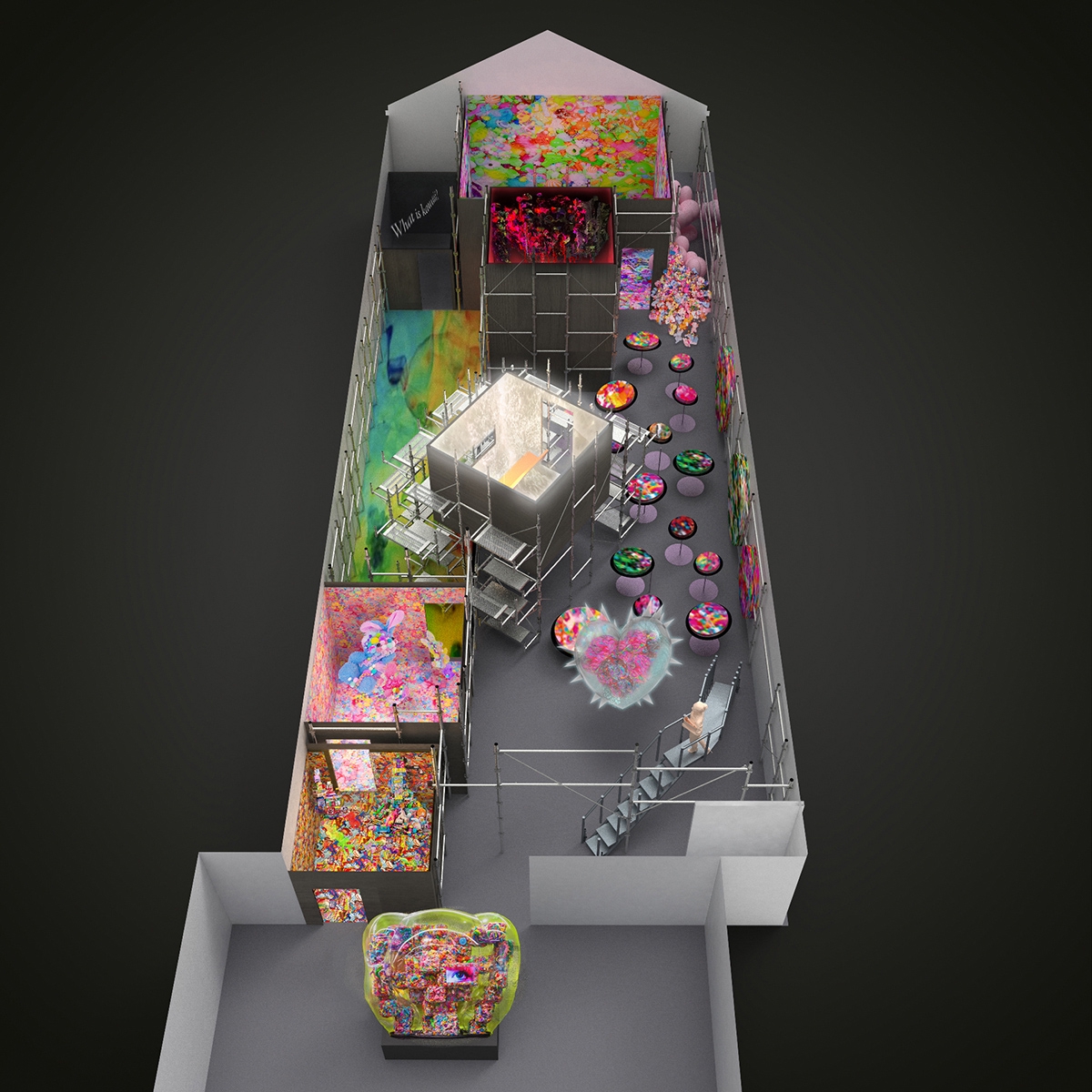 館内は「Sweets Hell」「Plushie Hell」「White Hell」「Materials Hell」「Words Hell」「Colorful Rebellion -Seventh Nightmare-」という6つの小さな部屋で構成され、部屋の外は「Real or Hell? 〜KAWAII-CORE」と名付けられたエリアです。「6つのKAWAII天国(地獄)の部屋と1つの現実」というコンセプトで、「現実」の先には遠くの空に光り輝くように透明なハート型の作品「KAWAII-CORE(カワイイコア)」があります。