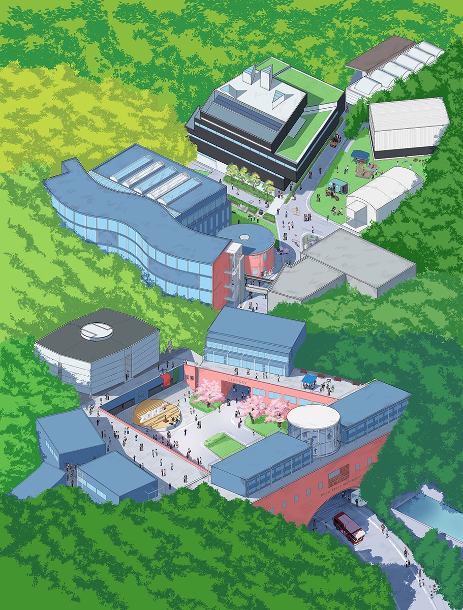 磯崎新 宇津貫キャンパス概念模型 2025年(室内建築専攻領域制作)本展は、多数の教員や学生が参加し、建築模型/版画/イラストレーション/写真/デジタルメディア/テキスタイルなど、それぞれの得意なジャンルを生かして作り上げています。宇津貫キャンパスの変遷と、キャンパスとともに歩んできた東京造形大学の学びを振り返る内容です。