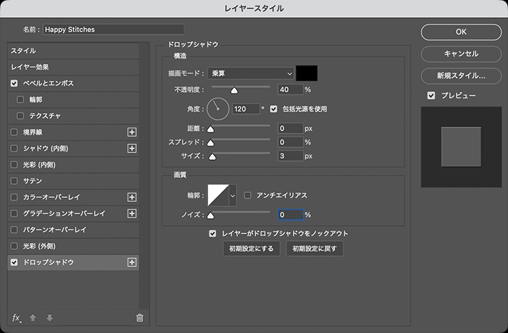 図12。レイヤースタイルの[ドロップシャドウ]を選択したら、[描画モード:乗算]、[シャドウのカラー:黒]、[不透明度:40%]、[角度:120°]、[距離:0px]、[スプレッド:0%]、[サイズ:3px]、[輪郭:線形]、[ノイズ:0%]に設定する