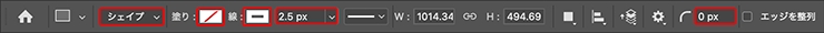 図4。オプションバーで[ツールモード:シェイプ]、[塗り:なし]、[線:白]、[線の幅:2.5px]、[角の丸み:0px]に設定する