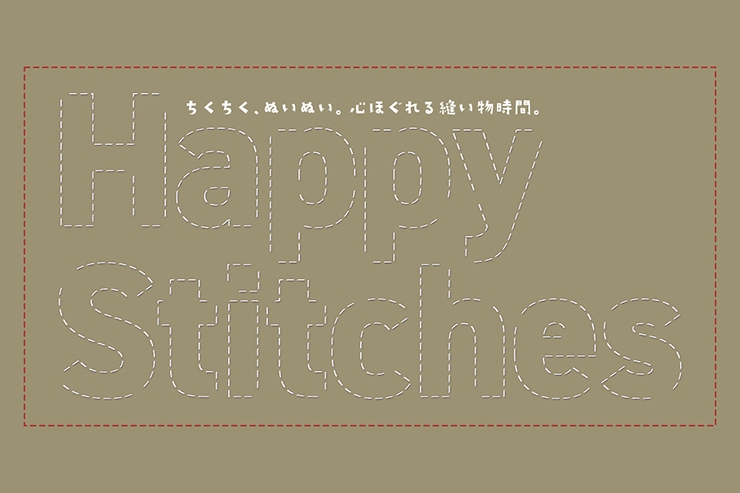 図1。背景レイヤーを好みの色(ここでは16進数カラーコード[#9b9273]の茶色)で塗りつぶしておく次に、横書き文字ツールで元になる文字(ここでは「Happy Stitches」)を入力して文字パネルでフォントやフォントサイズを設定