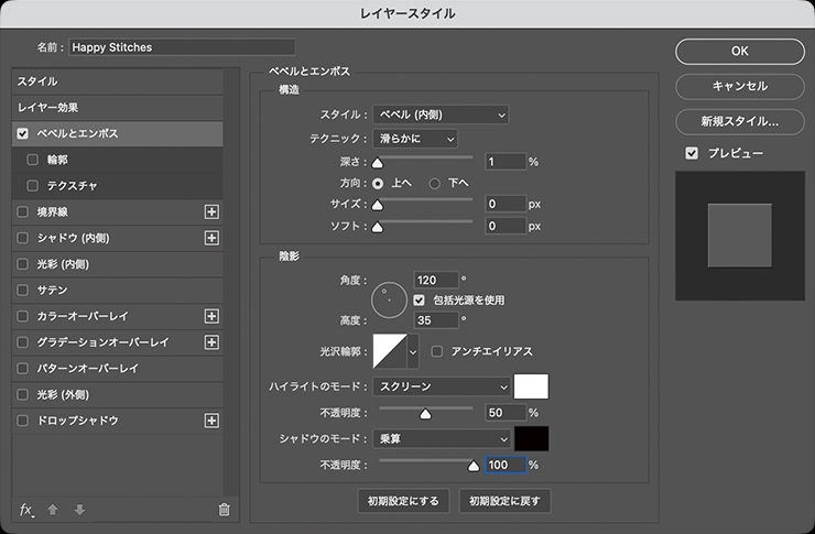 3.ステッチに立体感をつけてロゴを仕上げるロゴを仕上げていく。レイヤーパネルで、ステッチ風に加工した文字のレイヤーをダブルクリックしてレイヤースタイルダイアログを開き、[ベベルとエンボス]を、[スタイル:ベベル(内側)]、[テクニック:滑らかに]、[深さ:1%]、[方向:上へ]、[サイズ:0px]、[ソフト:0px]、[角度:120°]、[高度:35°]、[光沢輪郭:線形]、[ハイライトのモード:スクリーン]、[ハイライトのカラー:白]、ハイライトの[不透明度]を50%に、[シャドウのモード:乗算]、[シャドウのカラー:黒]、シャドウの[不透明度]を100%に設定する