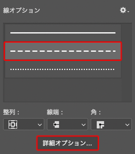 図5さらに[線の種類]をクリックして線オプションパネルを表示したら、プリセットから破線を選んでパネル下部の[詳細オプション]をクリック