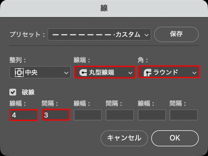 図6。線オプションパネルで破線を選んだら、パネル下部の[詳細オプション]をクリックする「線」ダイアログが表示されるので、[線端:丸型線端]、[角:ラウンド]、[線幅:4]、[間隔:3]に変更して適用する