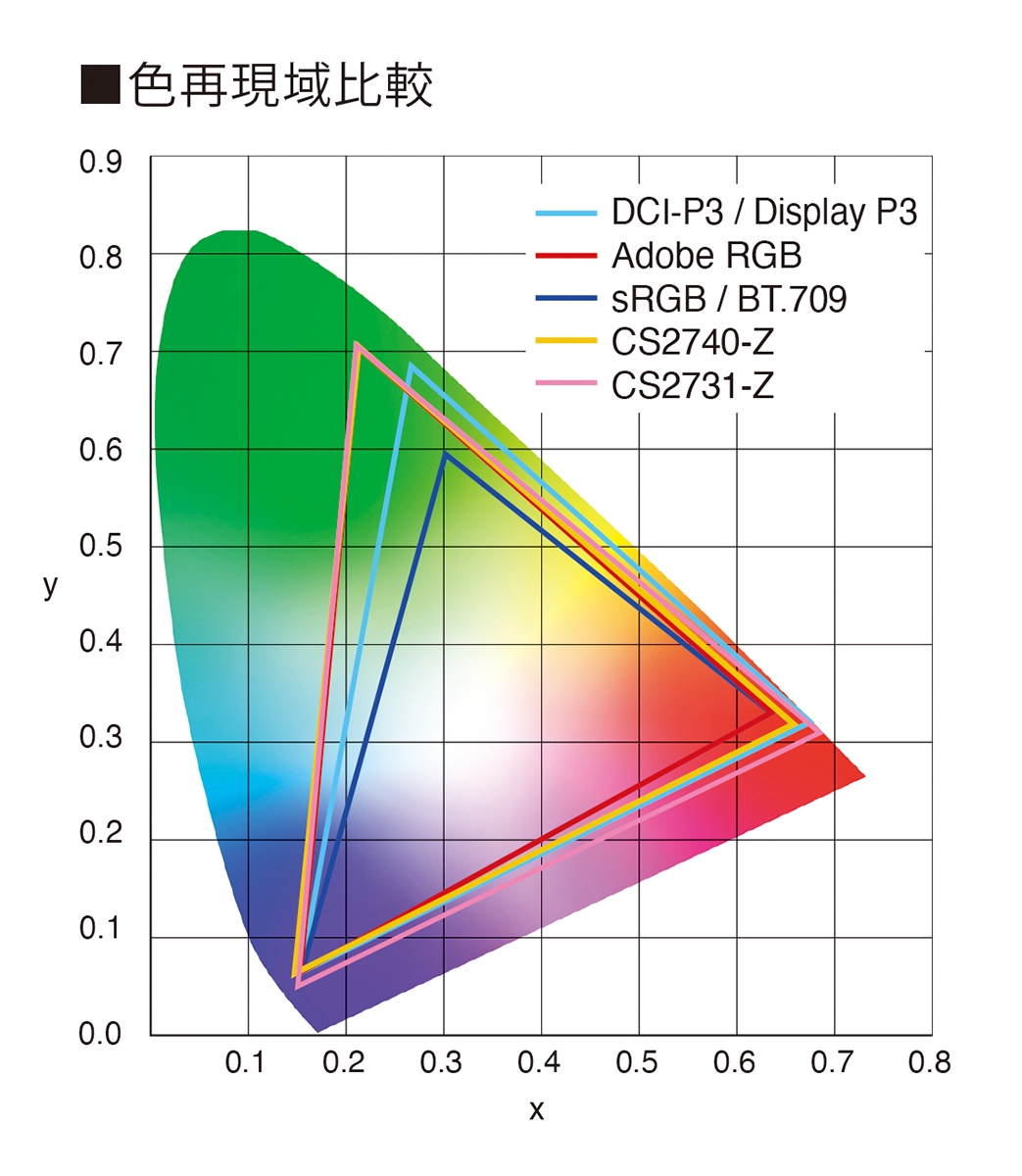 広色域表示でAdobe RGBは99%カバーデジタルシネマ規格「DCI-P3」の色域については、「CS2740-Z」では91%、「CS2731-Z」では95%がカバーされています。さらに両製品はAdobe RGBの色域を99%カバーしていることも特徴です。デジタル写真/デザイン/印刷/3DCGといった分野でのクリエイティブワークにも引き続き対応し、sRGB相当の一般的なモニターでは再現しきれない鮮やかな色味を忠実に再現できます。