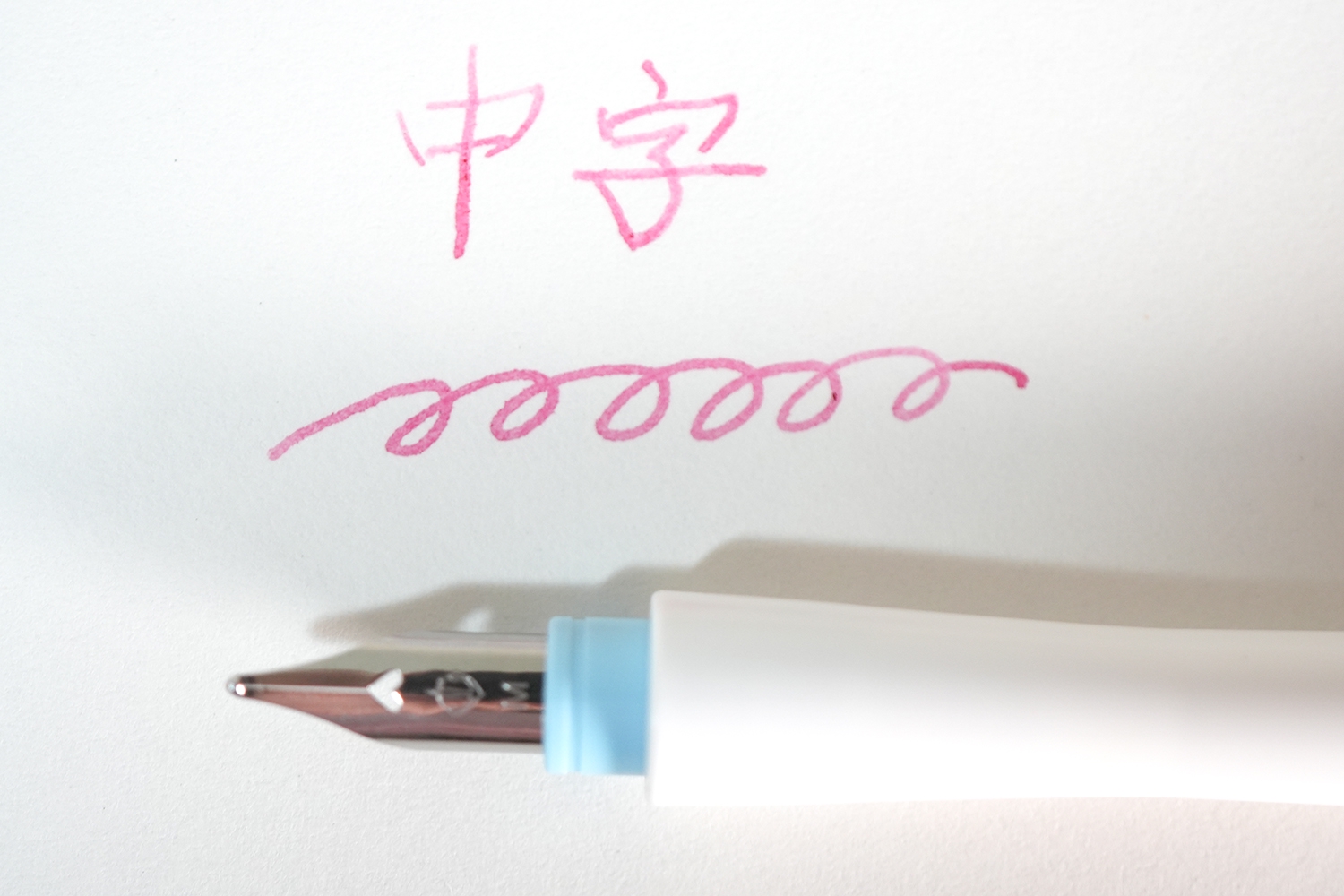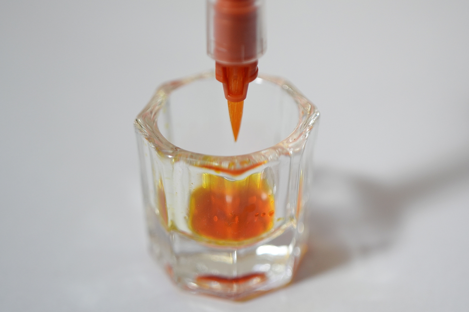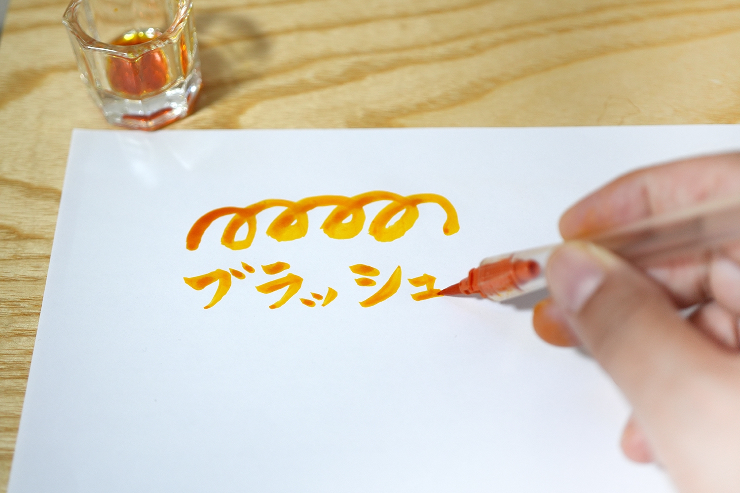 紙に文字や線を描いたところ。毛筆ならではの強弱をつけられる「万年筆ペン先のつけペン hocoro」シリーズの一番の特徴は、ペン先を水でゆすぐだけで簡単に色変えができる点です。「ブラッシュ」も水で流したらティッシュなどで水分を拭き取り、すぐ次のインクを使うことができます。そこがカートリッジ式ではなくつけペン式である大きなメリットと言えるでしょう。洗浄時は、ペン先のオレンジ色の部分に窓があいているので、そこに水がかかるようにすると根本にインクが残りづらくなります。