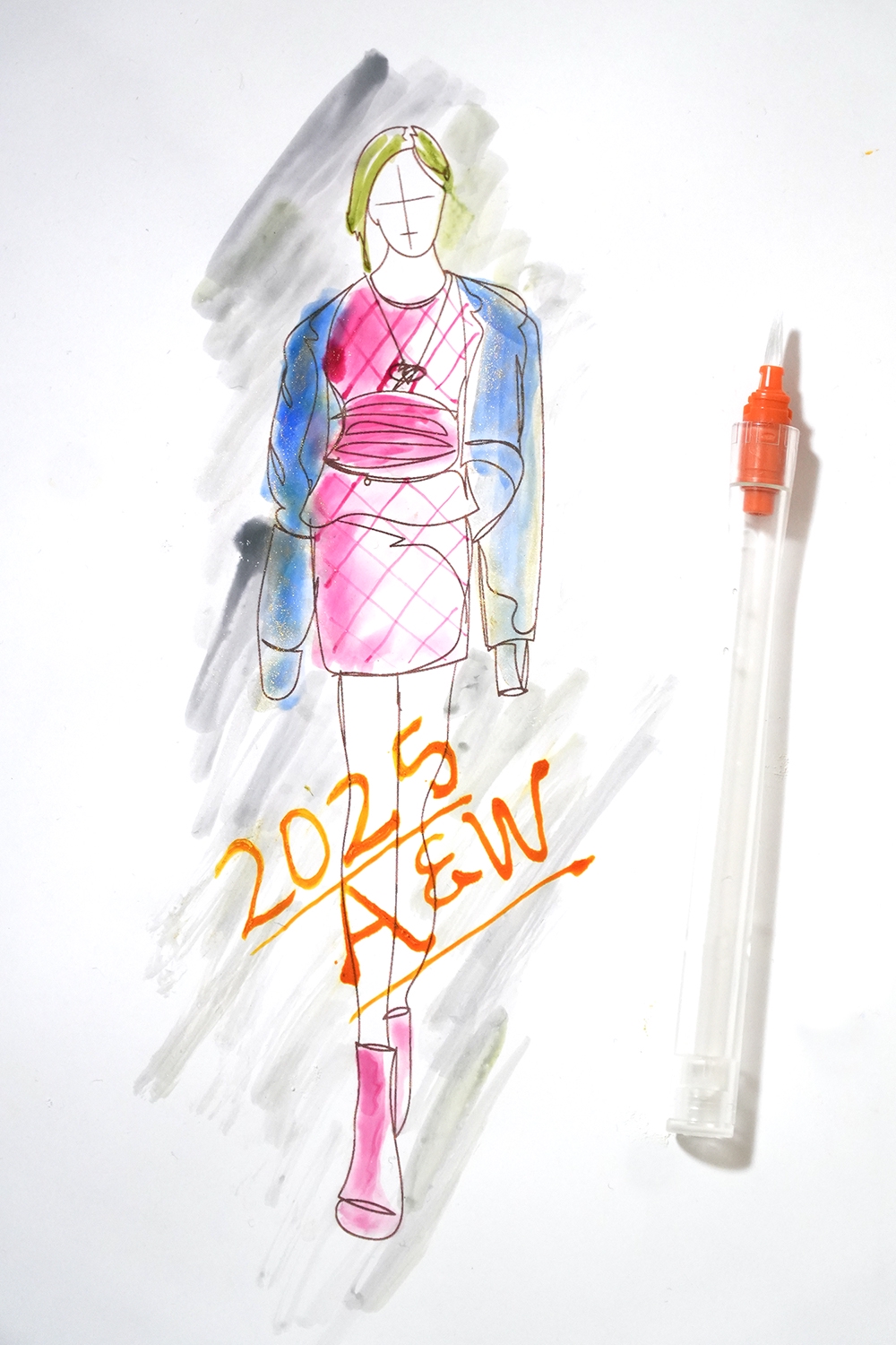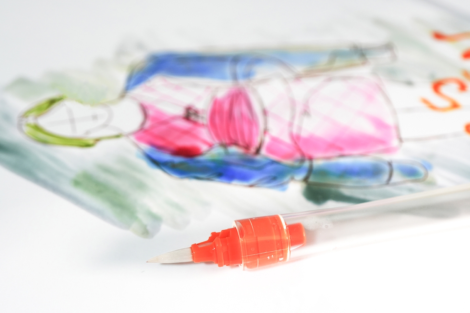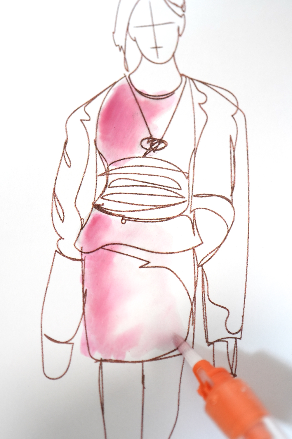 ファッション画に「万年筆ペン先のつけペン hocoro ブラッシュ」などを使い、サッと色を塗った「万年筆ペン先のつけペン hocoro ブラッシュ」のメンテナンス「万年筆ペン先のつけペン hocoro」シリーズのペン先はすべて、使わないときはペン軸の内側に差し込むことができます。特に毛筆タイプの「ブラッシュ」はペン先が押されたり曲がったりして変な癖がついてしまうと使いづらくなるので、ペン先を痛めてしまうリスクが減りとても便利です。出先や外で使いたいときなどの持ち運びに適していますし、デスクの引き出しにしまっておくのにもよいでしょう。これは他の絵筆や書道筆にも導入できないかと思うくらい、穂先を痛めず収納するシステムとして優秀だと思いました。