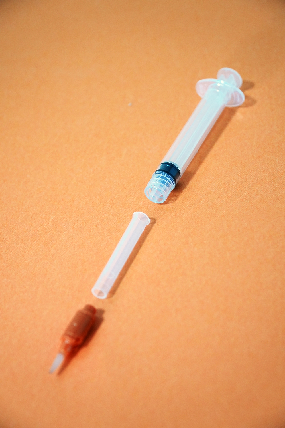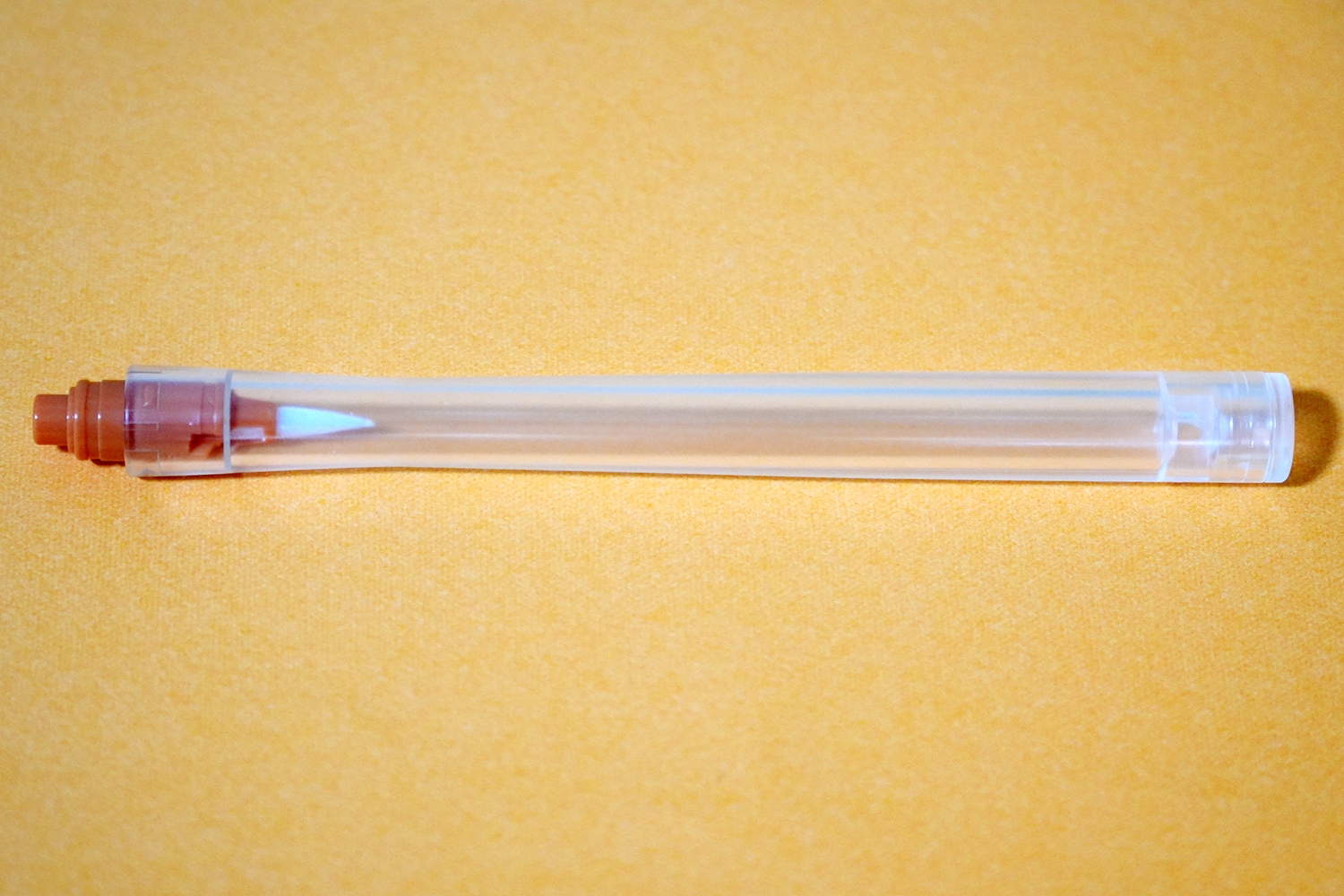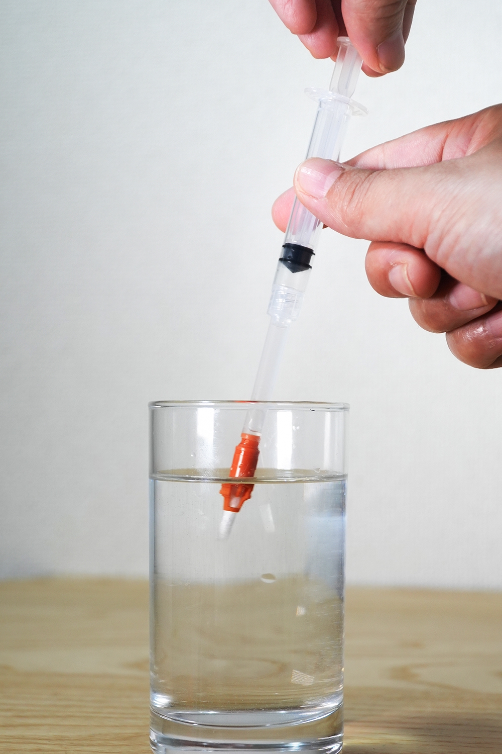 使わないときはペン先を内側に差し込んでおけるので、穂先を痛めづらい濃い色のインクを使ったあとなどには、水で洗っても「ブラッシュ」のペン先に色が残ってしまうことがありますが、使用には問題ありません。別売りの「万年筆ペン先のつけペン hocoro ブラッシュ用洗浄器」を使えば、ペン先の後ろ側から水を流せてよりしっかり洗浄できます。注射器のような形をした洗浄器本体の先に洗浄ノズル、その先に「ブラッシュ」のペン先をとりつけます。次に、ペン先を水の中に入れ、後ろのプランジャー部分を上下して水を吸い上げて後ろから押し出すことで穂先を洗浄します。筆は根本に色が残りがちだけれど、あまりぎゅうぎゅう洗うと痛めてしまうという悩みがありましたが、後ろから水を流すことで根本からきれいになります。この仕組みも、一般的な絵筆や書道筆に採用してほしいと思うくらい便利でした。