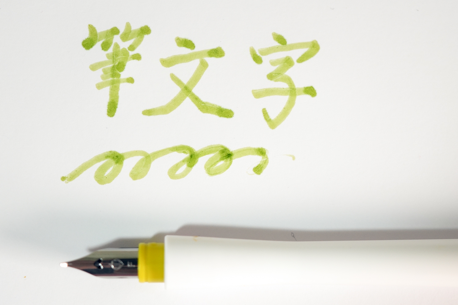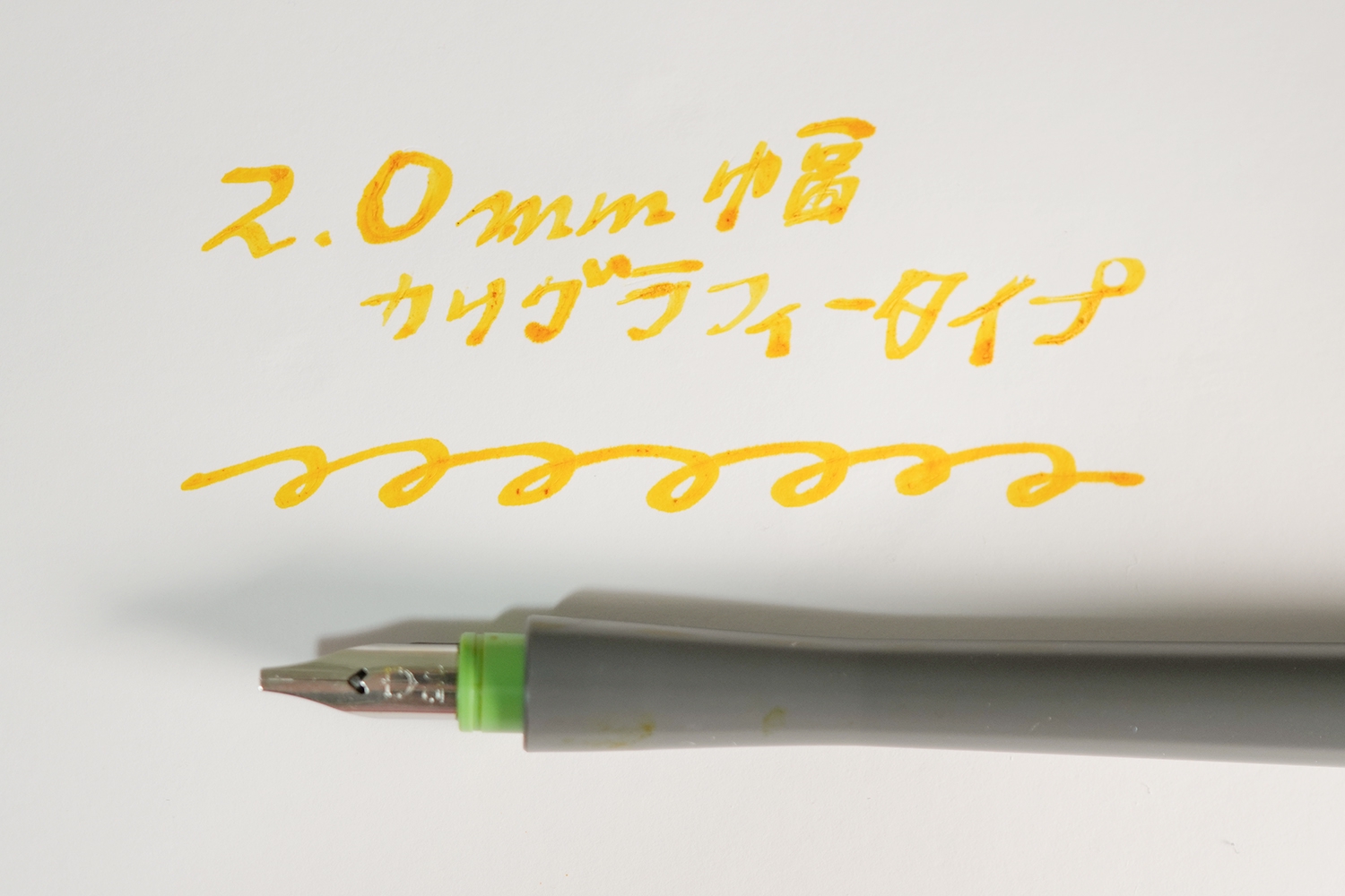 ペン先に万年筆インクをつけて使うナイロン製のこしのあるペン先で文字や線も書きやすく、一度インクをつけるとけっこう長く保ちます。
